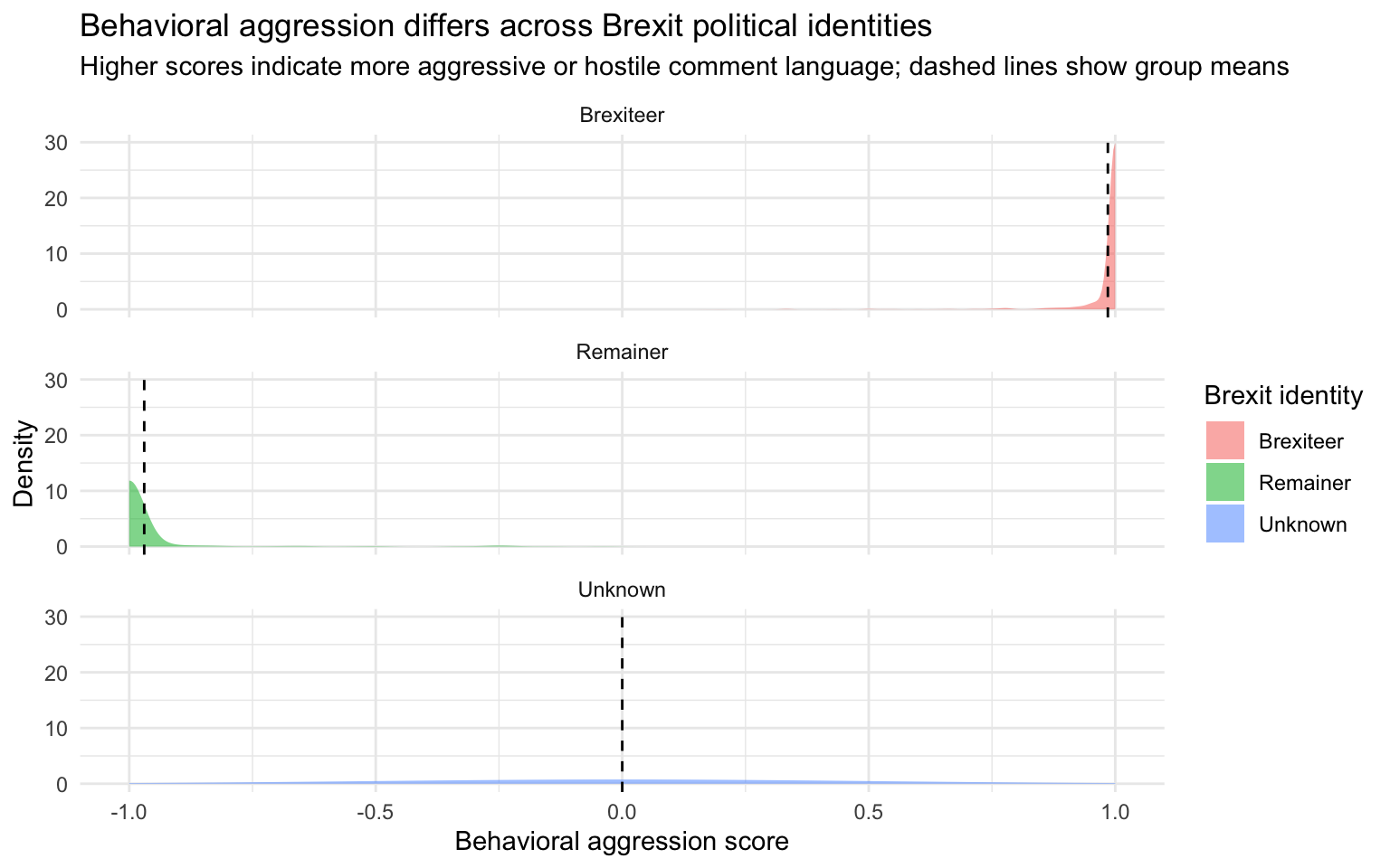 The table shows strong polarization in comment tone across Brexit political identities. Brexiteer comments (3,613) have an average aggression score of 0.99 (median = 1), while Remainer comments (781) average –0.97 (median = –1), indicating clear separation between the two groups. The Unknown group (606 comments) centers at 0, suggesting neutral or unclear positioning. The close alignment between mean and median values suggests these patterns are consistent across comments rather than driven by a few extreme observations, providing evidence of systematic differences in tone by political identity.