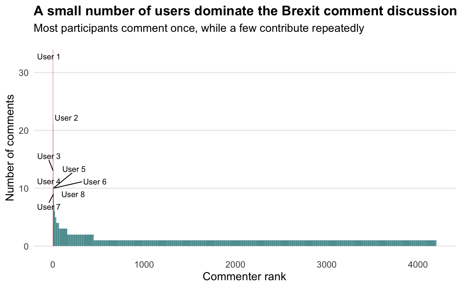 This visualization shows that participation in the Brexit discussion is highly concentrated. While thousands of users contributed at least one comment, most posted only once. A small minority of highly active participants contributed many more comments than the average user. I revised the draft visualization to highlight these extreme contributors while keeping the full distribution visible.