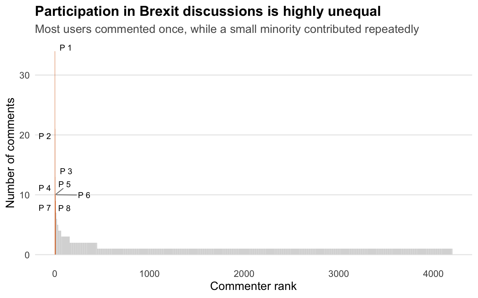 This visualization examines whether participation in Brexit comment discussions is broadly shared or dominated by a small number of highly active users. Participant IDs are anonymized and are **not shown** in the final graph.