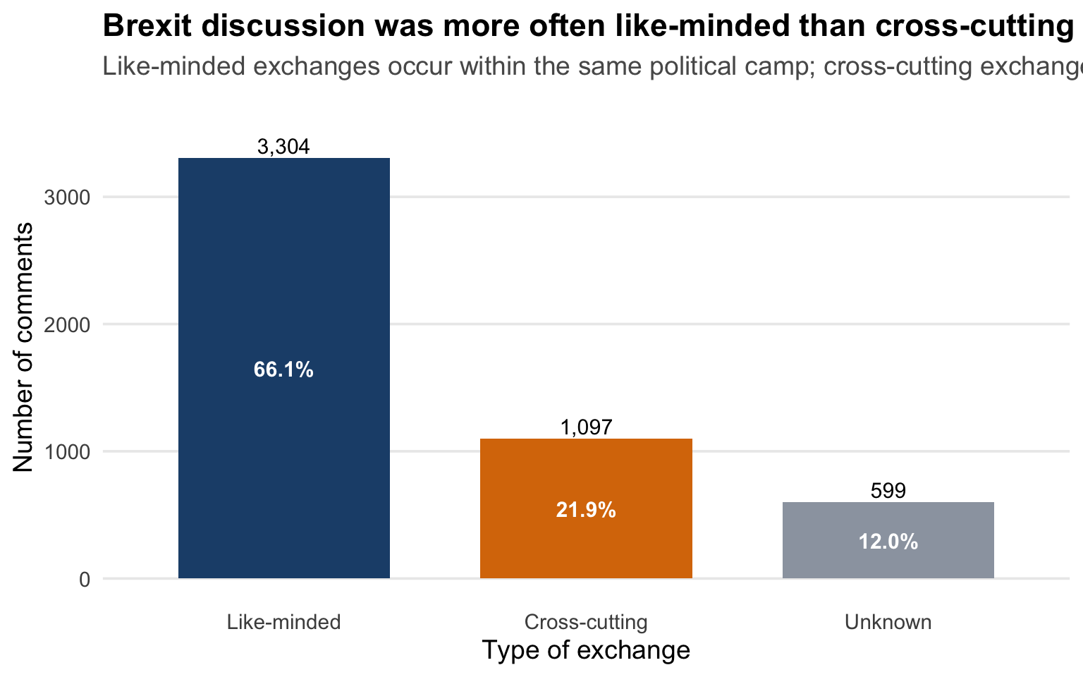 This visualization shows that Brexit discussion was much more likely to occur in like-minded settings than across political disagreement. Out of all coded exchanges, the majority were like-minded rather than cross-cutting. I revised the chart by adding clearer labels, a more informative subtitle, and percentages inside the bars so that readers can immediately understand both the concept and the scale of the pattern.