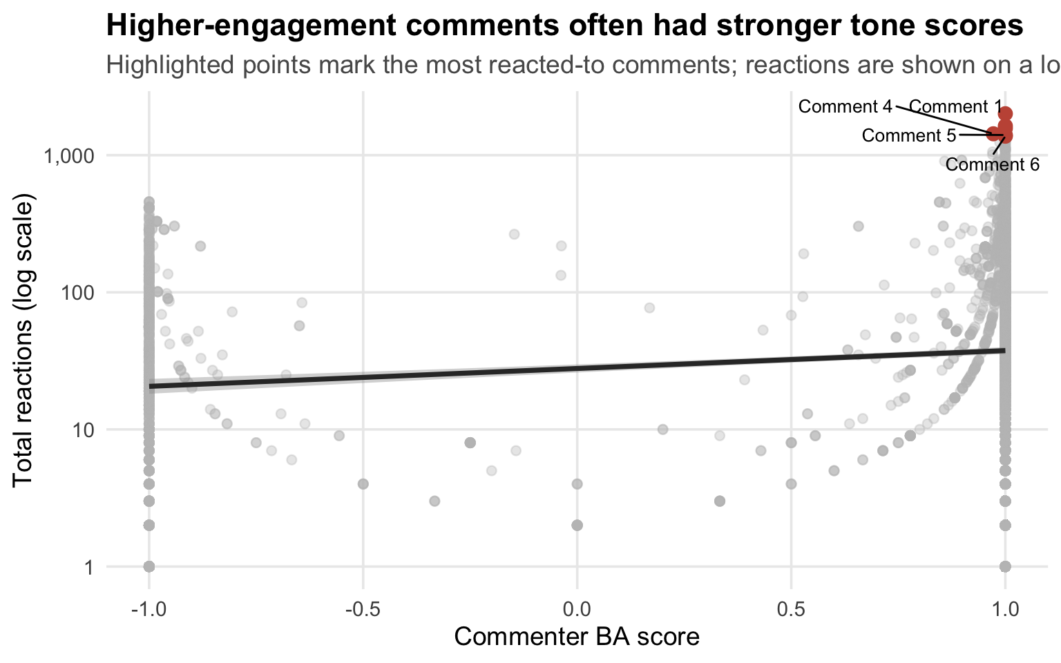 ‘Commenter_Total_Reactions’ measures how many reactions a comment received, while ‘Commenter_BA_Score’ captures the tone score associated with the comment. Because reaction counts are highly skewed, a few comments receive much more engagement than most others. A log scale makes that pattern easier to interpret.